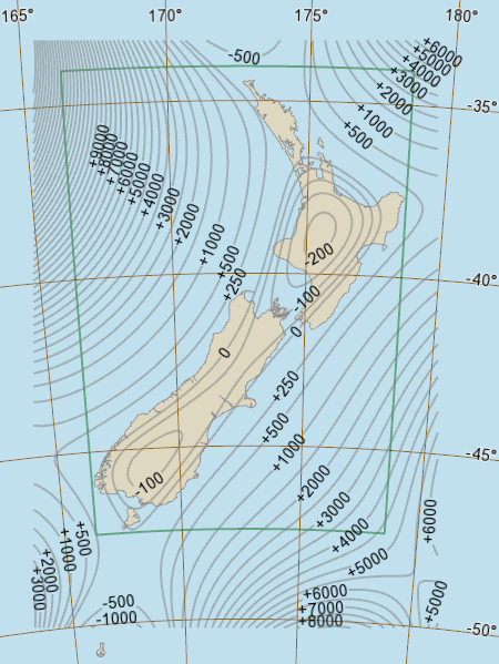 The map above shows lines of constant local scale factor for NZMG. The displayed numbers show how much the local scale factor differs from 1, expressed in ppm (parts per million). Such lines for a map projection do not usually follow the country shape so well, but the mathematical formulas for this projection are tailor-made for New Zealand. The scale variation is only +/- 250 ppm on the main islands, which is excellent.