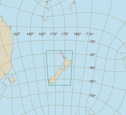 The image above shows how the projection bends the graticule into whirlpools at four places. In fact, geographic features even farther away can be projected into the area of interest. So, the projection must not be used too far from New Zealand. To avoid trouble, Carmenta has limited the extent of the projection. (The image above was created before the limitation was implemented.) However, to enjoy full safety from the limited extent, you must insert a RectangleClipOperator to the left of a DataSet, whenever the view uses the New Zealand projection and the dataset does not.