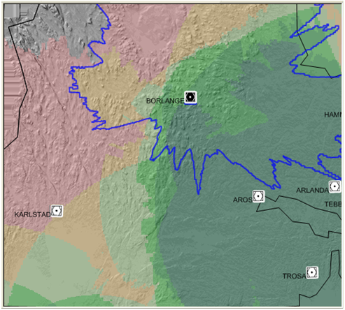 That is better, but how was it done? Well, the inverted colors of the BORLÄNGE symbol are simply displayed by a Visualizer in a VisualizationOperator.SelectionVisualizers (used only for beacons that are selected). But the blue outline of the viewshed was harder to achieve. It is displayed by a separate layer, where the original output from a LineOfSightOperator is passed to an IsolineOperator that generates an isoline at 2000 meters. The difficulty was to ensure that the isoline was generated only for selected beacons, since the built-in support for selection visualization cannot be used here. We solved it by some application code: