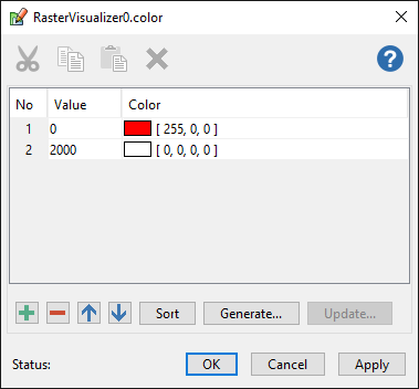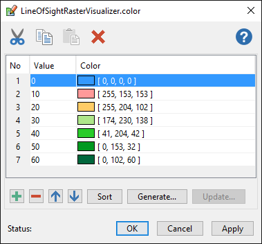 A better idea is to reclassify the viewshed rasters, so that a visibility height in the range 0 - 2000 m is replaced by some positive value, say 10, while other visibility heights are replaced by zero. The results are then summed to one raster by a RasterMergeOperator with operation = Add. The summed raster will contain the value 10n in each cell that can be seen from n observers. So we can use a better RasterVisualizer, based on a traffic-light analogy: one beacon is not enough (red), two beacons are so-so (yellow), and three beacons suffice (light green). More beacons are even better (darker green colors). But zero beacons would be useless (invisible).