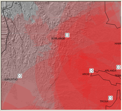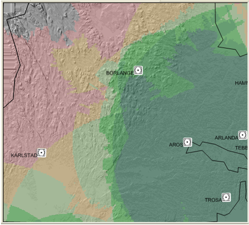 In the west half, you can see the difference between zero, one, two, and perhaps three overlapping viewsheds. But in the east half, there are many radio beacons around Arlanda, so their overlapping viewsheds obscure the background shading, and their boundaries are hard to see.