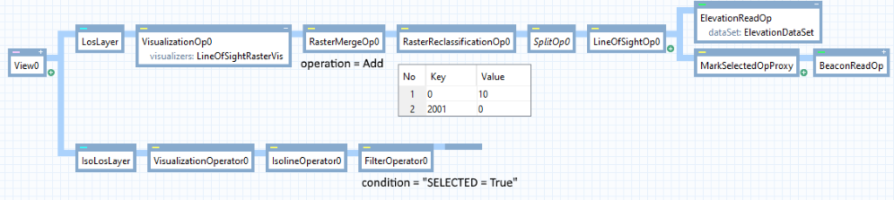 The proxy for MarkSelectedOp is placed between the LineOfSightOperator and the ReadOperator for beacons, where it will add the attribute SELECTED = True to all beacons that are selected. For each beacon, its SELECTED attribute will survive the LineOfSightOperator; that is, the attribute will appear on the viewshed rasters for the beacon. So it easy to insert an FilterOperator that allows only viewshed rasters with SELECTED = True to reach the IsolineOperator. Here is a screenshot of the configuration: