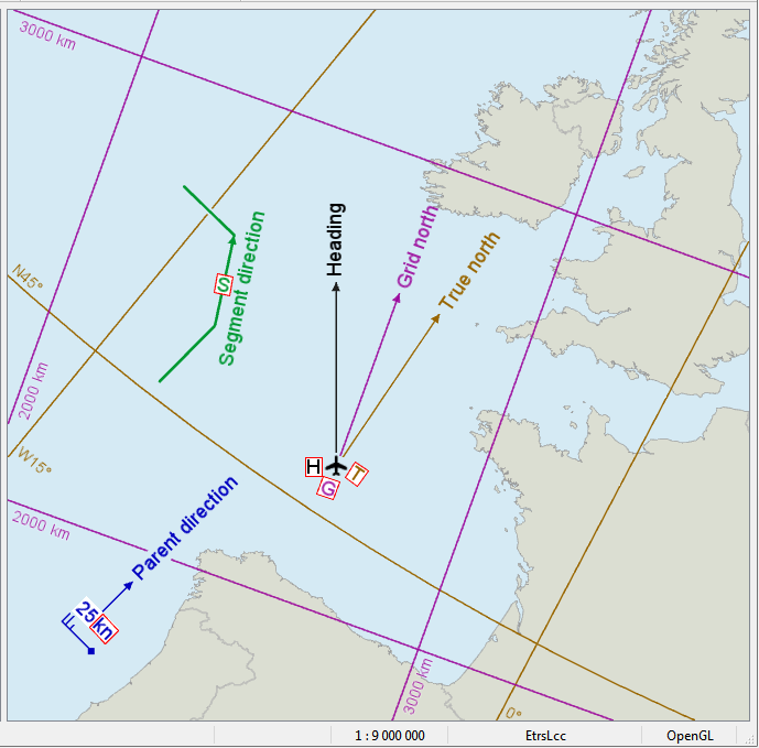 Furthermore, the view has a View.Rotation = 340°, to show a heading-up moving map. This means that the heading differs from both grid north and true north.