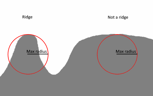 There is also a threshold that excludes ridges and valleys that are insufficiently pronounced. This threshold is applied like a circle touching the surface along the ridge's curvature axis. if the surface bends inside the surface, the ridge is detected, otherwise not. This threshold is set using the maximum curvature radius parameter. The unit of this parameter is meters. The MaxCurvatureRadius does not affect detection of point-geometries.
