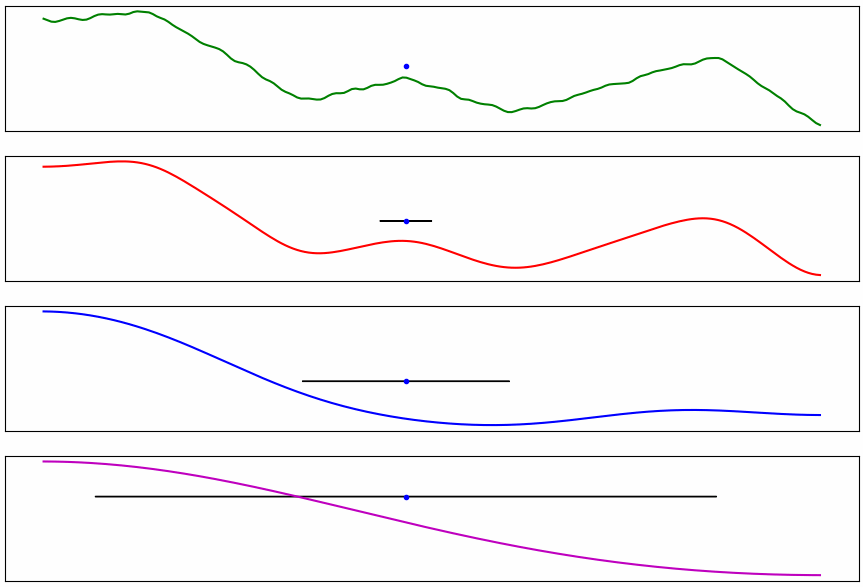 What constitutes a detectable terrain feature is dependent on the characteristic size property. A large characteristic size means that only large objects such as mountain ranges are detected while a smaller size results in the detection of smaller bumps and crevices. The CharacteristicSize property is used to smooth the analyzed terrain data. The effect of different CharacteristicSize values are illustrated in the image below. Notice that the whether a point is determined to be located on a ridge, in a valley or on a slope is dependent on the CharacteristicSize property.