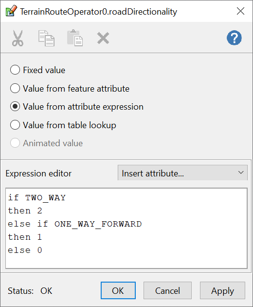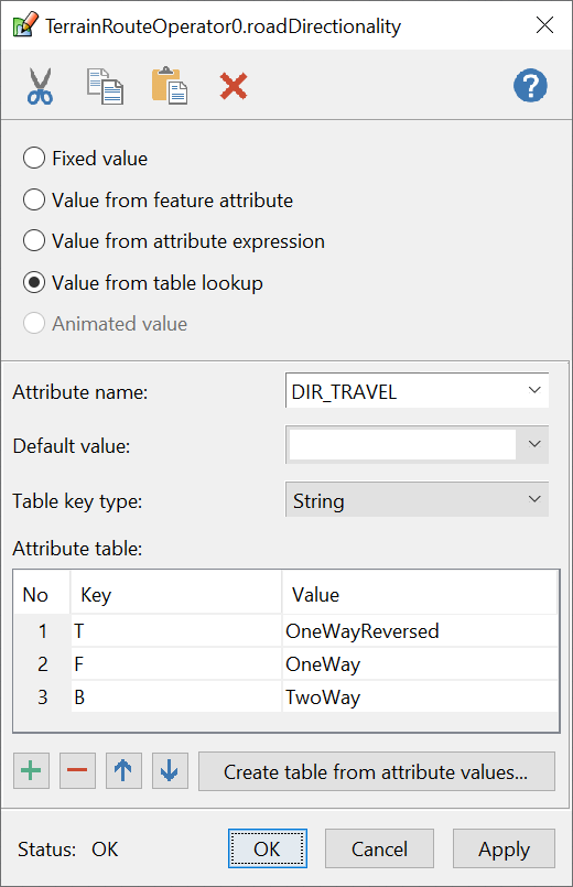 The value of the property TerrainAccessOperator.RoadDirectionality or TerrainRouteOperator.RoadDirectionality is normally an attribute variable that depends on road attributes; the attribute variable could use table lookup or an expression.