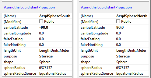 Rasters for the polar zones, south of 80°S or north of 80°N, will use two polar coordinate reference systems that we call Wgs84AeqdSphereSouth and Wgs84AeqdSphereNorth. These do not have EPSG codes and are not predefined in Carmenta Engine, but they will be created by the dataset. Each one is formed by combining the Wgs84 geodetic datum with an AzimuthalEquidistantProjection in polar aspect, using spherical projection formulas.