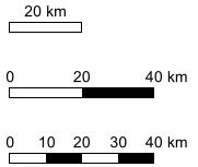 The scale bars above were generated with One, Few and Several divisions, using the same value of ScaleBar.MaxLengthPixels, in a scale where a bar of the maximal pixel length would be 45 km. The first bar had to become 20 km long, since 50 km would have been too long, and since 40 length units is not an allowed length for a single division.