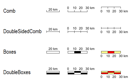 | Comb | 0 | A horizontal line with vertical ticks that point down if the numeric labels are below the scale bar, otherwise up. |