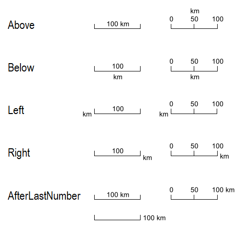 When there is only one division, there will be only a single number label. In this case, if the number and the unit shall both be Above or both be Below the scale bar, the result will be the same as if the unit placement had been AfterLastNumber, since it would look silly to stack the two labels vertically. This effect is displayed in the upper left example, which can be compared with the upper right one.