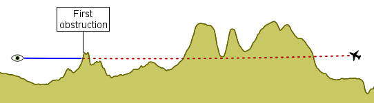 observerToFirstObstruction, the line feature represents the first part of an interrupted line of sight, from observer to first terrain obstruction.