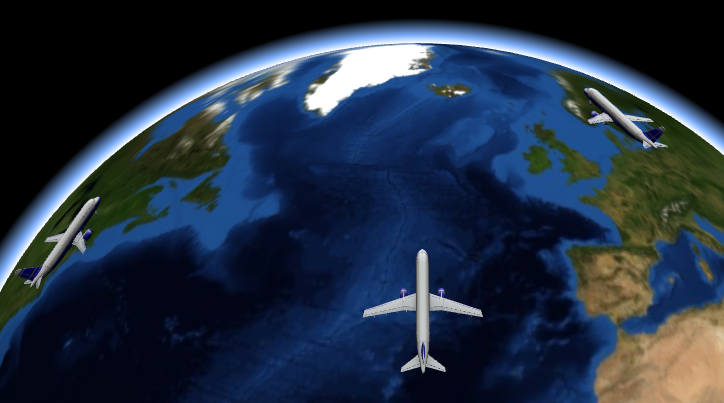 A 3D symbol is oriented using the rotation, roll and pitch properties on SymbolVisualizer. The default values are intended to orient the model's forward in the north direction and the model's up in the globe's upward directed, as illustrated by this image: