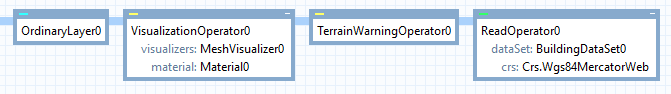A 3D globe view can identify the ground without help (it is provided through GlobeView.ElevationInput) but if you have other meshes that you want to apply the terrain warning to, for example building models, then you can add a TerrainWarningOperator before the VisualizationOperator that visualizes them: