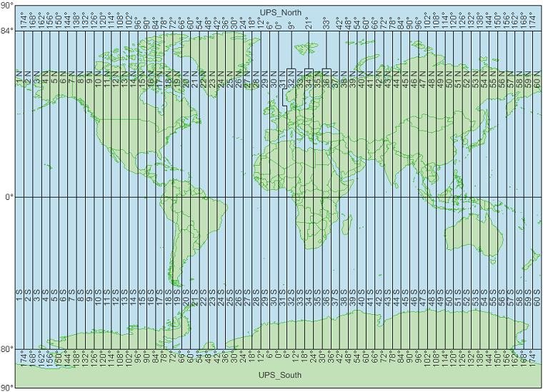 The UTM (Universal Transverse Mercator) projection system divides the earth into 60 zones using different central meridians spaced 6 degrees apart. Each zone consists of two halves, north and south of the equator, which use different projections, but only the false northing differs. On the southern hemisphere, the false northing is defined to make the northings reach 10 000 km at the equator; on the northern hemisphere, it is defined to make the northings restart from 0 km at the equator. Although this difference is trivial, you must take care to use the correct hemisphere.