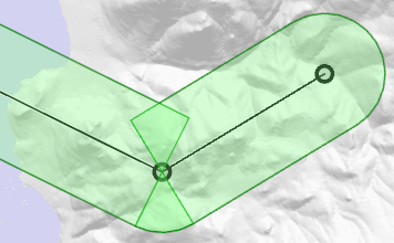 The terrain-based output is a raster with the same numeric format as the input elevation raster, containing the route clearance above each terrain cell near the route, and elsewhere the undefined value, which will be the largest representable number in the raster format.
