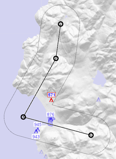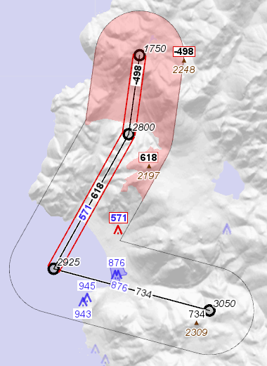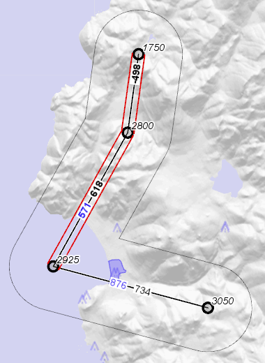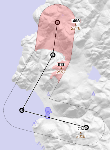 In areas where there is no terrain elevation raster at all from ElevationInput, there will be no terrain clearance raster in the output and no terrain spot features, although flying over unknown terrain is of course dangerous. So if the elevation raster does not completely cover the area near a leg, then the output leg will get an attribute for leg-terrain clearance that will be ‑100 000, and this can be used to highlight the danger, since a safe value must be positive. This leg attribute is called vcopLowestTerrainClearance; see the section Route-based Output below.
