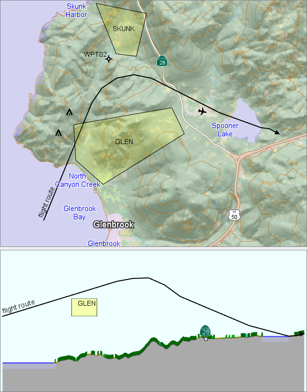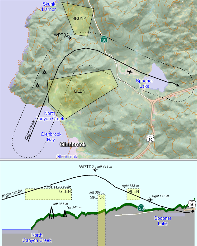 The 3D point features that are slightly beside the route - two obstacles, a waypoint, and the aircraft - do not appear in the profile. The blue names of water areas are also missing because they are attributes not of the lake polygons, but of points from a separate text dataset.