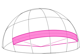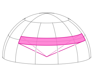In the images above, the observer is at ground level, so the bottom half of the terrestrial globe is below ground and not displayed. The graticule of the globe has 30° spacing. The picture direction is mainly toward us, but slightly to the right: note that the ray from the observer through the center of the lobe goes in the same direction in both cases.