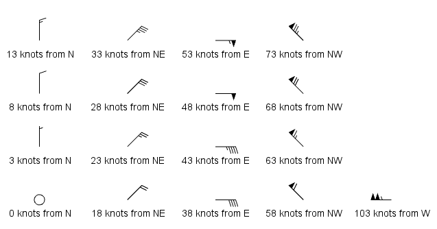 A WindBarbSymbol is used together with a SymbolVisualizer to draw wind barbs that represent wind direction and speed. The direction is controlled by PointVisualizer.Rotation property. The barbs are drawn depending on the Speed property. It follows the following logic: